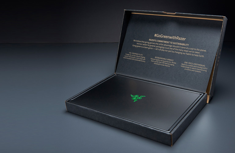 Razer заменит весь пенополиэтилен в картонной упаковке на гофрированный картон, пригодный для вторичной переработки, и увеличит использование коробок из обычного текстурированного картона с минималистичным дизайном. Razer также использует соевые чернила для печати на всей упаковке.